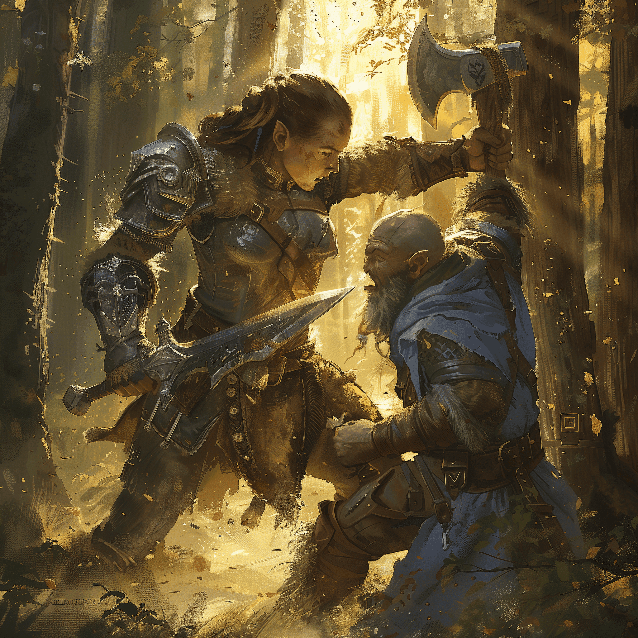 - SEU TRAIDOR! - Gritou furiosamente Kaeleen saltando de trás de uma caixa de madeira. Sua maça brilhava com uma cor dourada, mas o anão foi mais rápido e saltou para trás. Onde a maça de Kaeleen atingiu o solo, um clarão foi emitido e a neve derreteu, mostrando o chão queimado como que por fogo logo abaixo - É o seu fim, Borin! - Mas antes que pudesse levantar a maça novamente, Kaeleen parou e analisou o cenário logo atrás do anão: o sol se punha no horizonte anunciando o prelúdio da noite. Um frio tomou-lhe a espinha: ela estava tão próxima de Borin, era apenas um acerto e seria o fim do anão... Mas e se ele tivesse algum truque na manga... Ela não podia perder tempo. - Elara, depressa! - Kaeleen guardou a maça no cinto e num golpe rápido deu um chute no anão que caiu de costas no chão sob uma pilha de destroços e corpos.